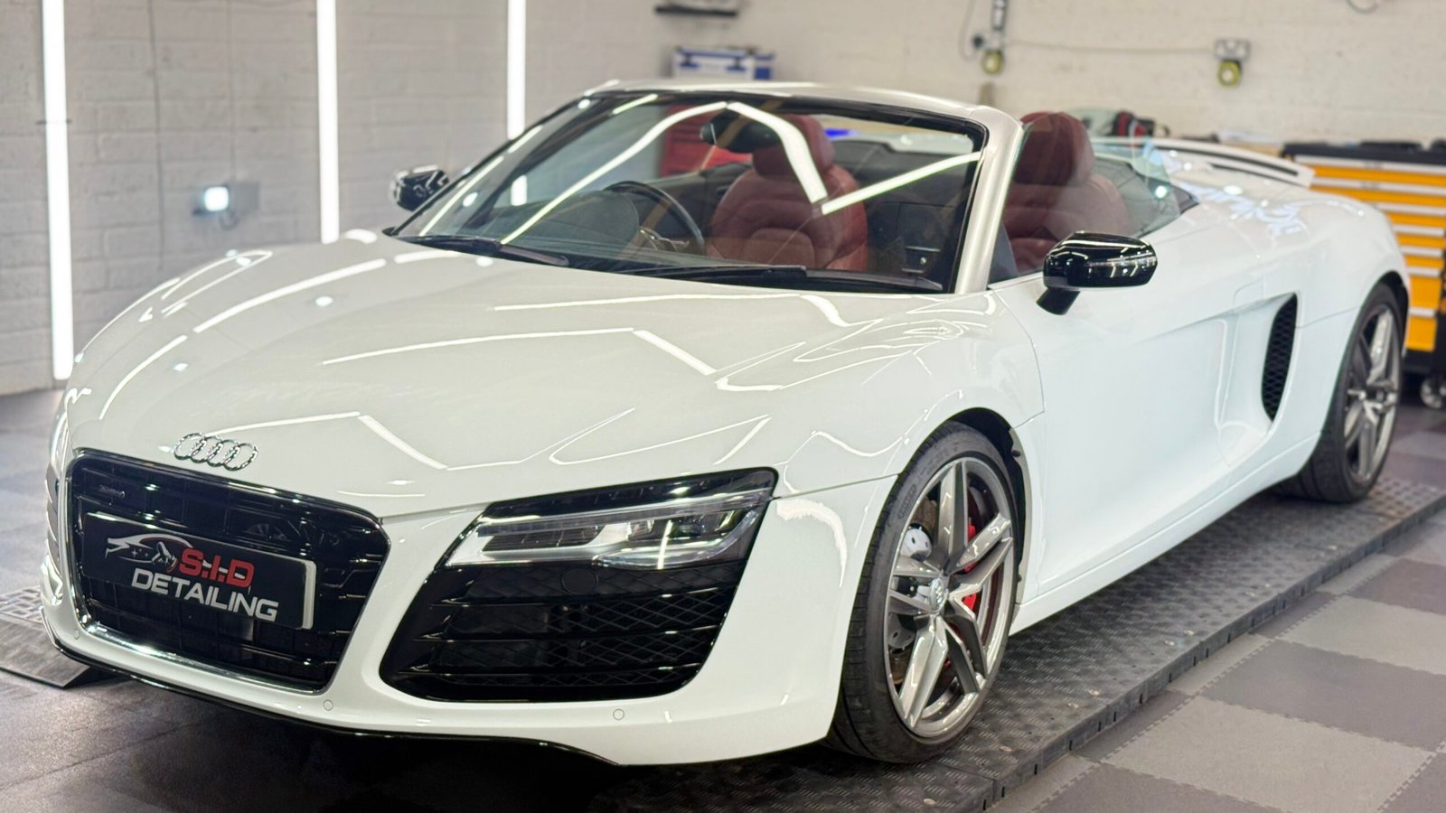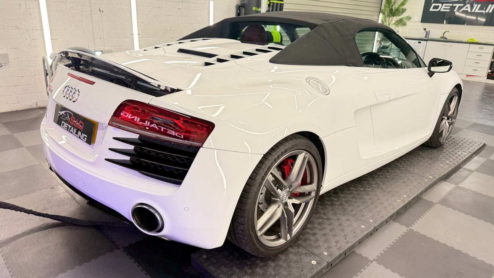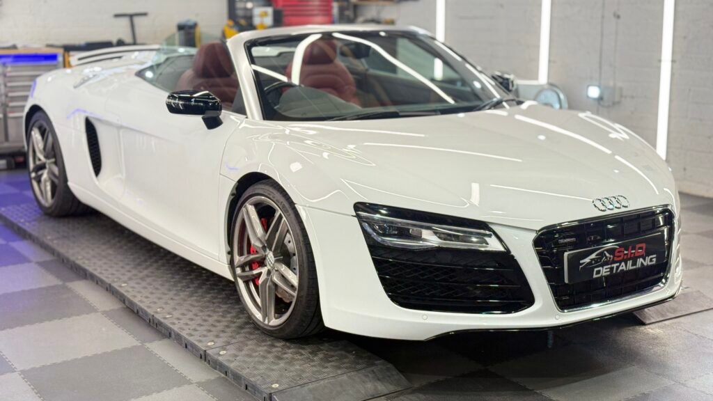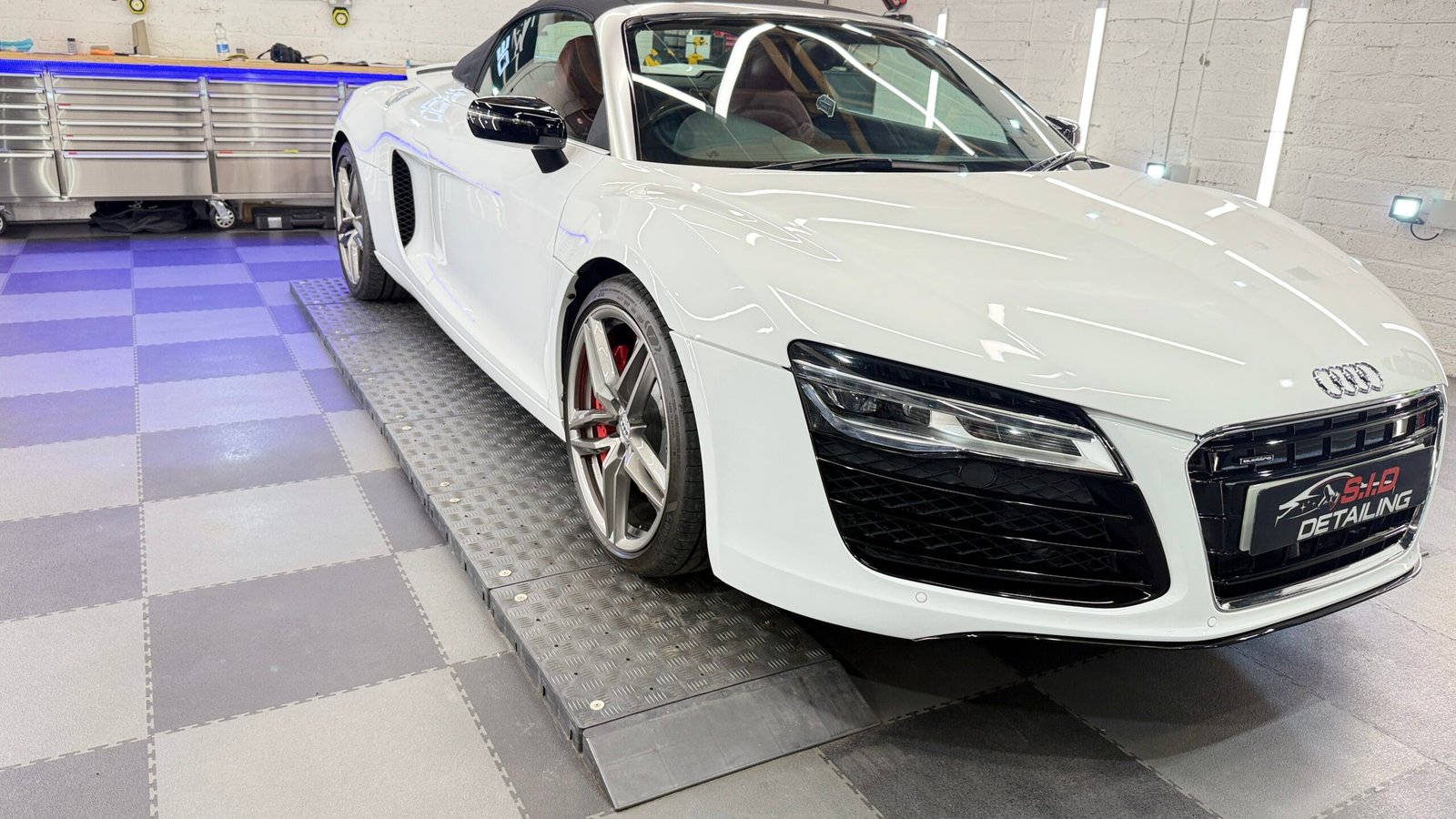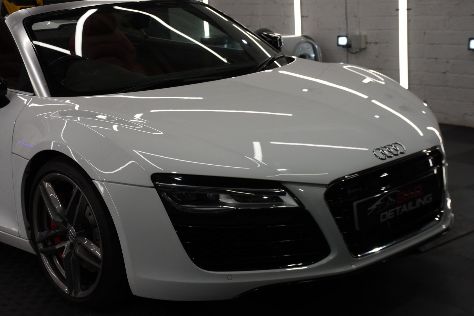 This R8 received multi-stage paint correction to perfect the finish, followed by ceramic coating on the body and wheels for long-term gloss and easy maintenance. The fabric roof was deep-cleaned and treated with a hydrophobic protector, ensuring tight water beading and durable convertible top protection.