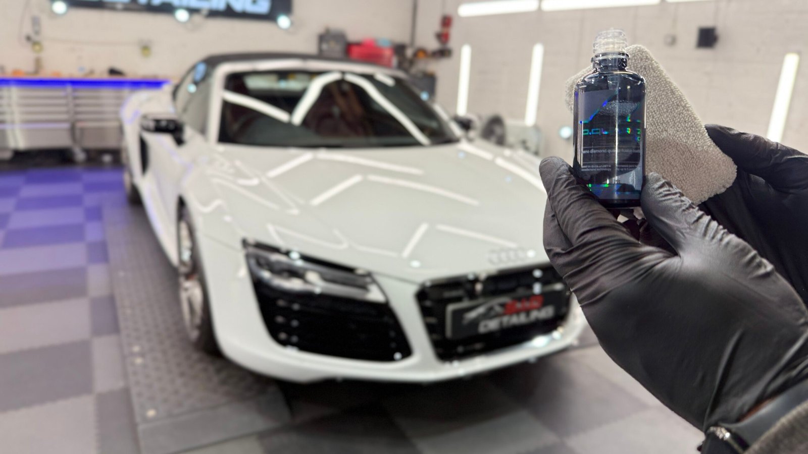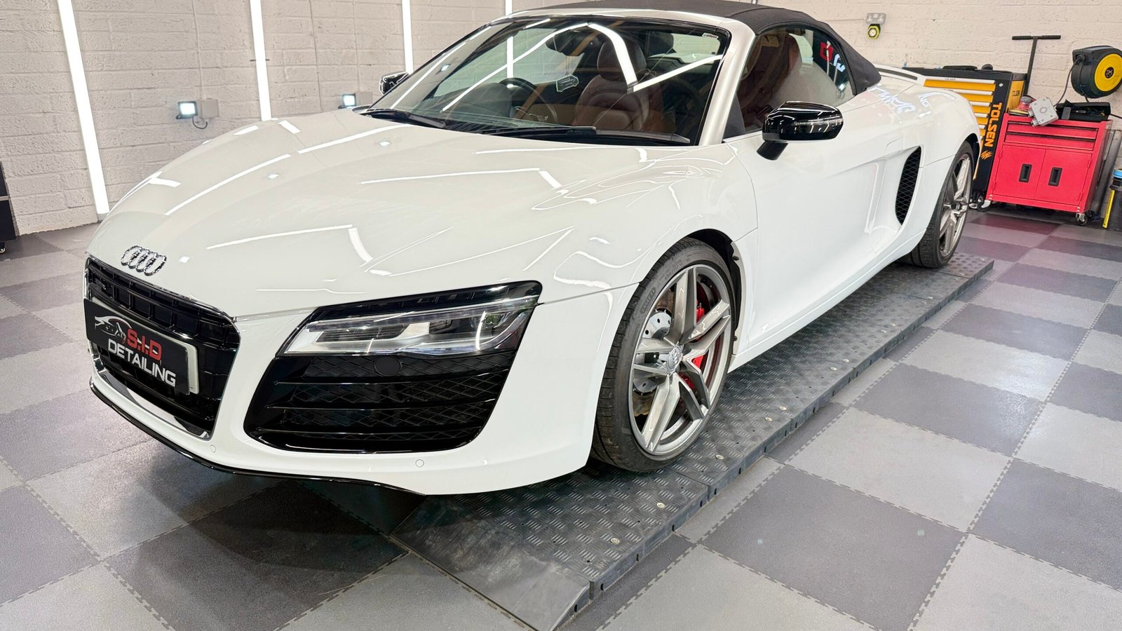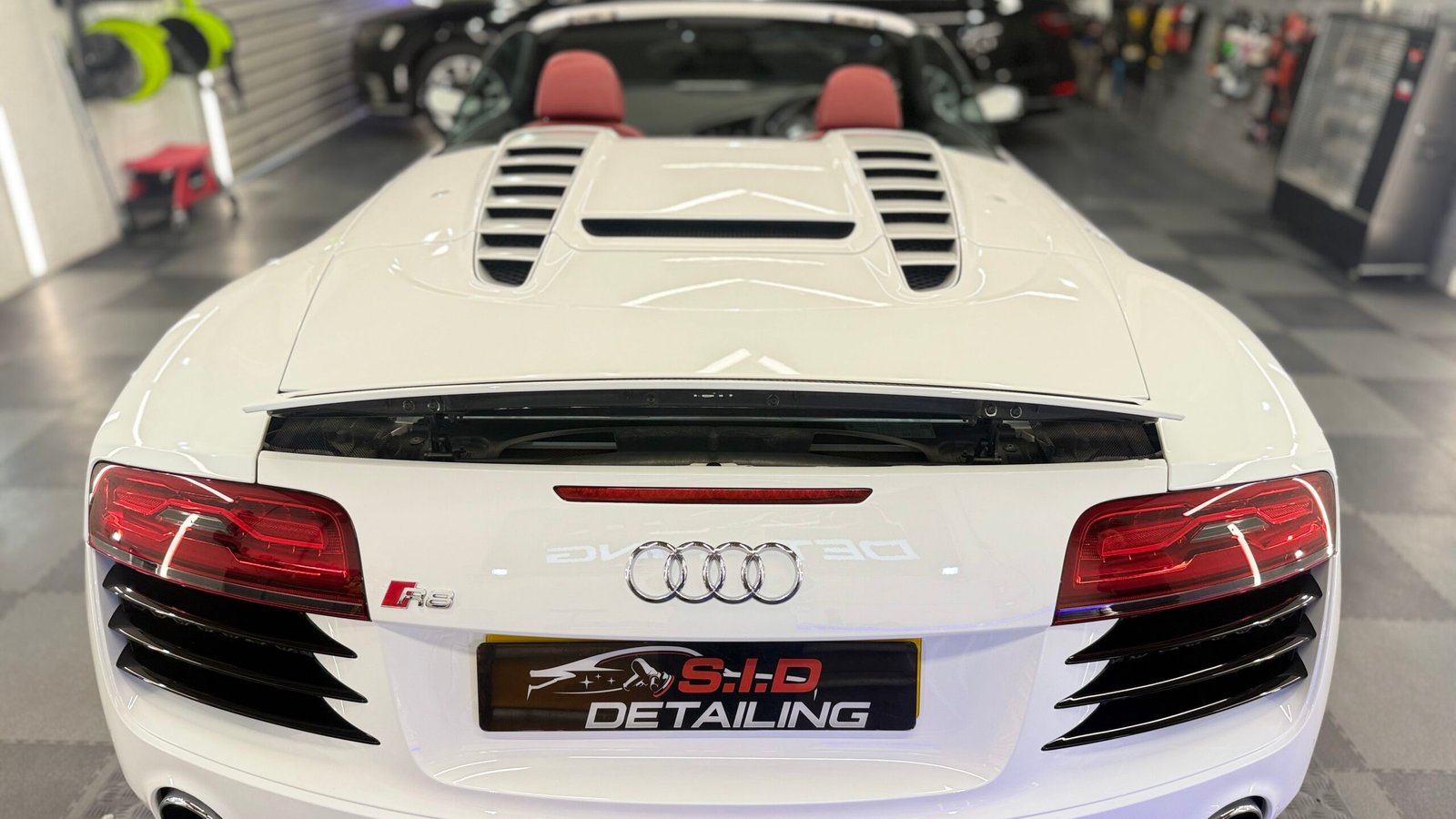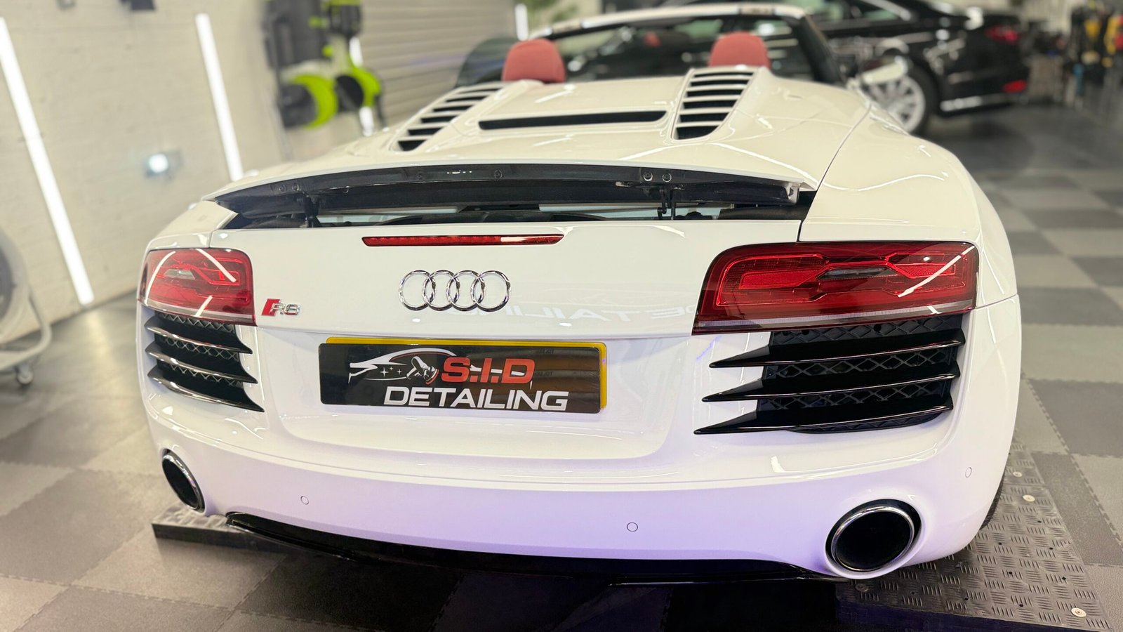 This R8 received multi-stage paint correction to perfect the finish, followed by ceramic coating on the body and wheels for long-term gloss and easy maintenance. The fabric roof was deep-cleaned and treated with a hydrophobic protector, ensuring tight water beading and durable convertible top protection.