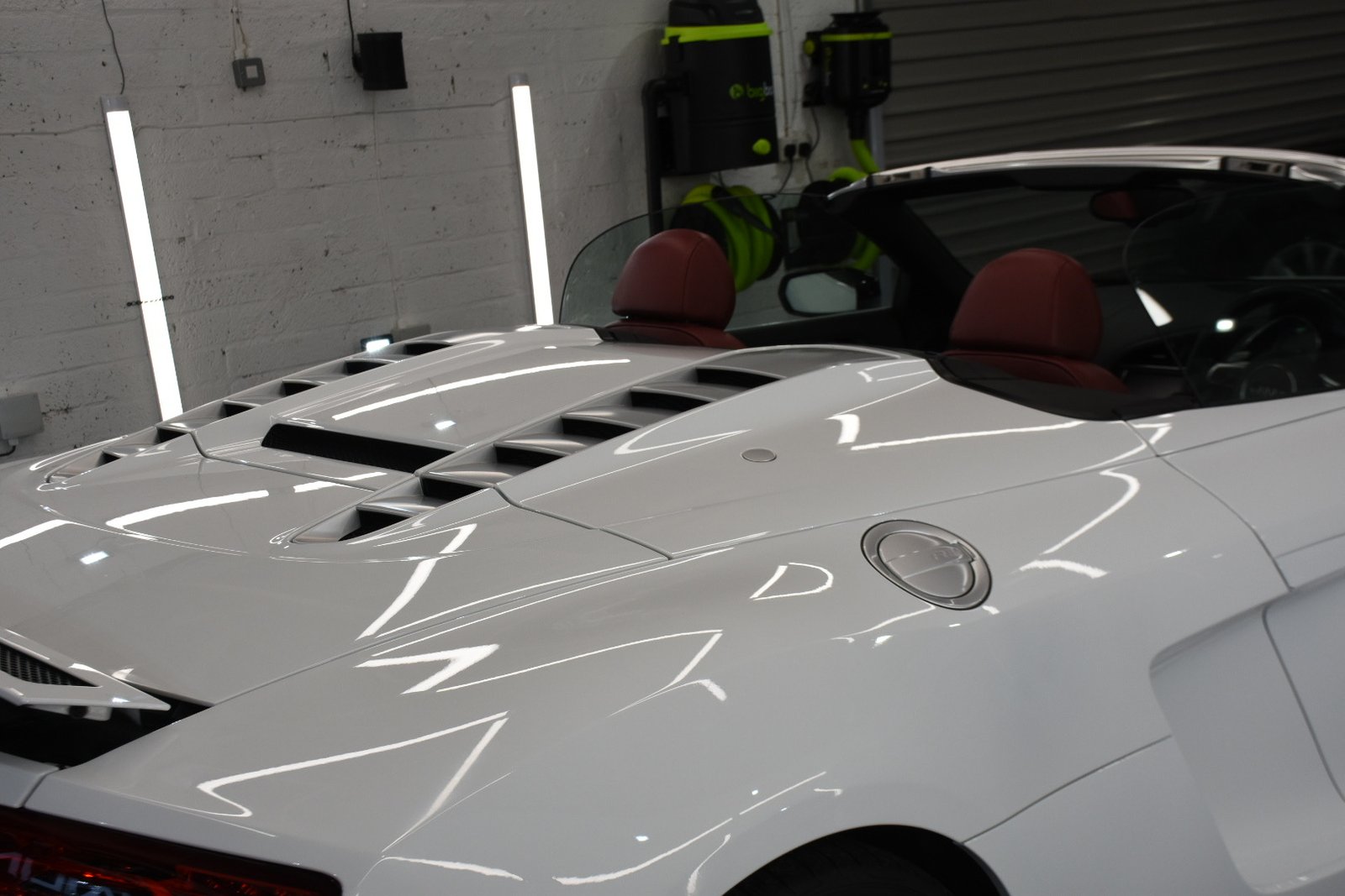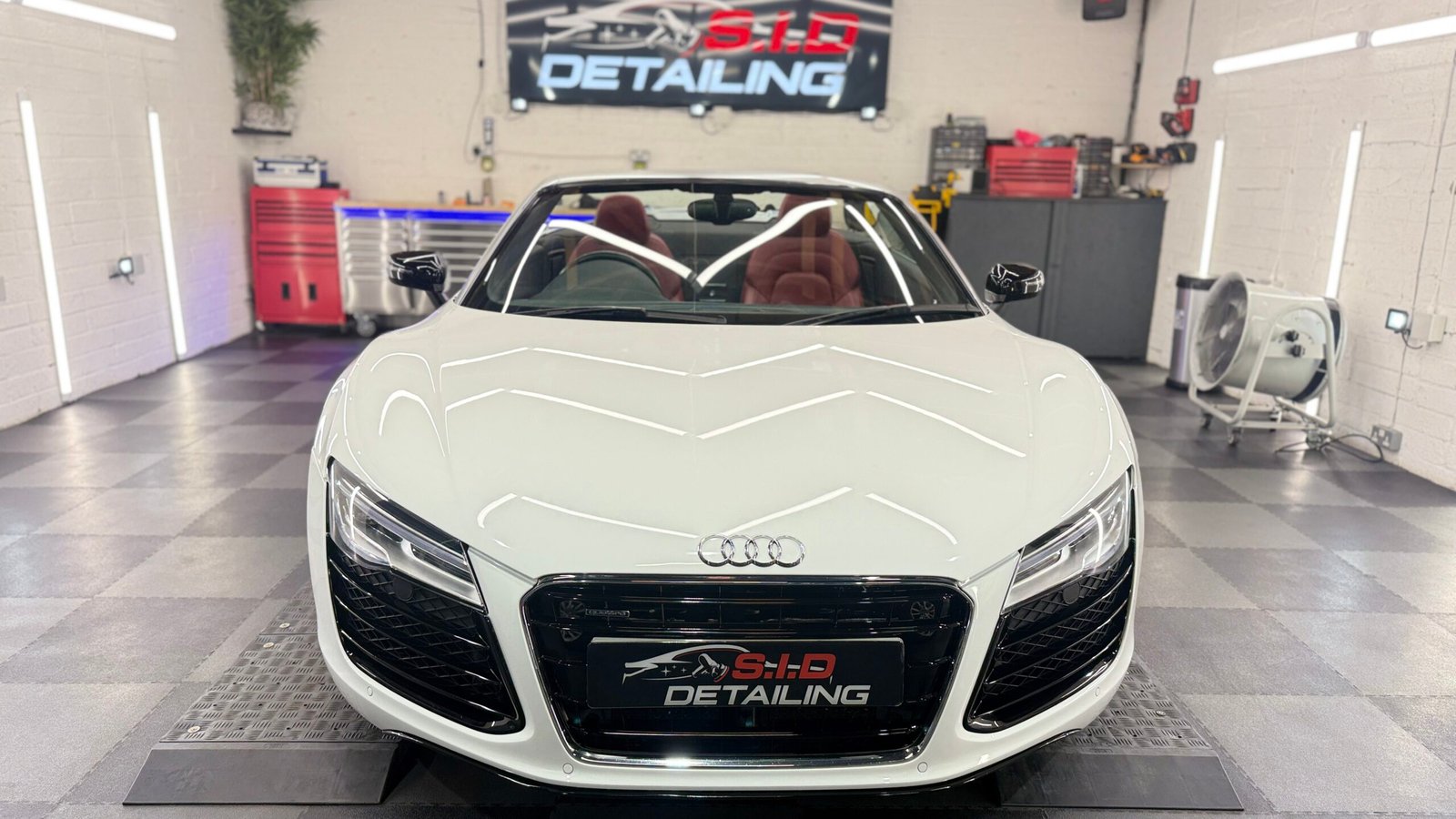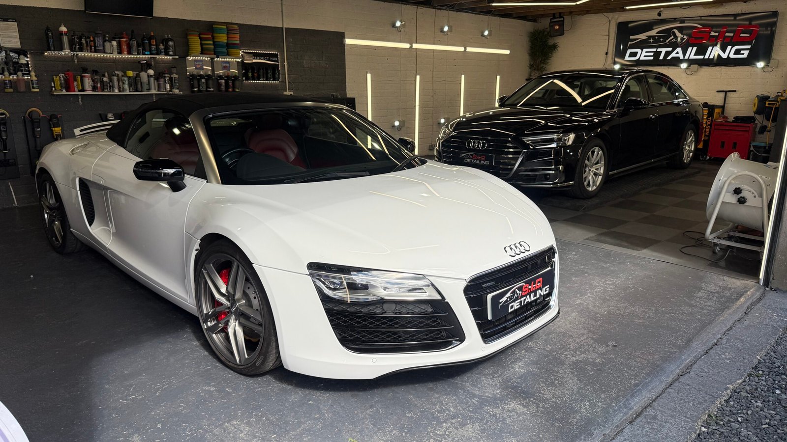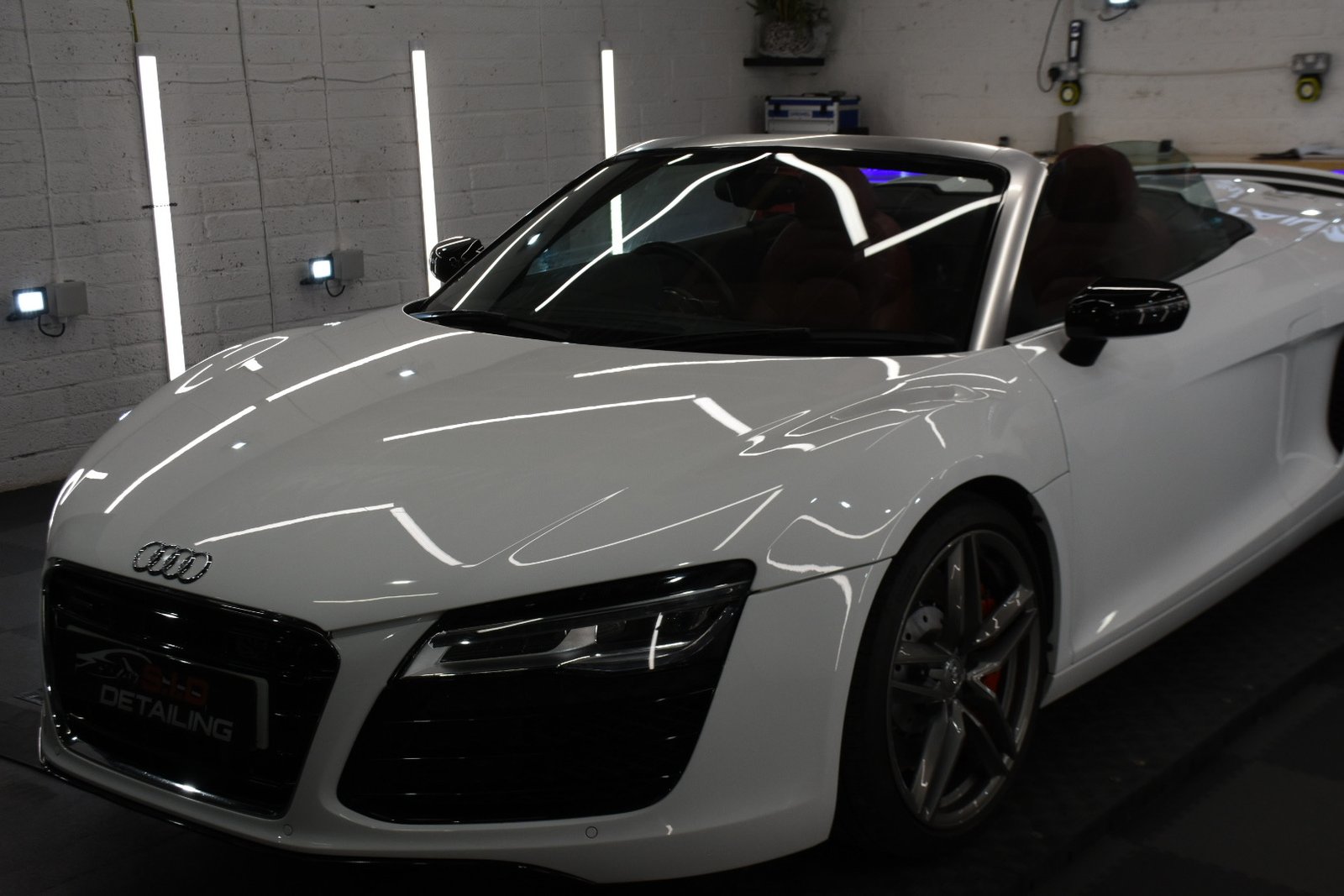 This R8 received multi-stage paint correction to perfect the finish, followed by ceramic coating on the body and wheels for long-term gloss and easy maintenance. The fabric roof was deep-cleaned and treated with a hydrophobic protector, ensuring tight water beading and durable convertible top protection.