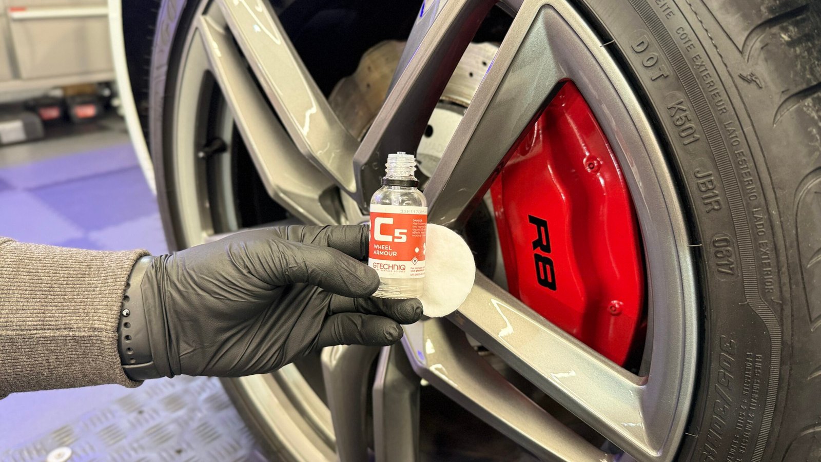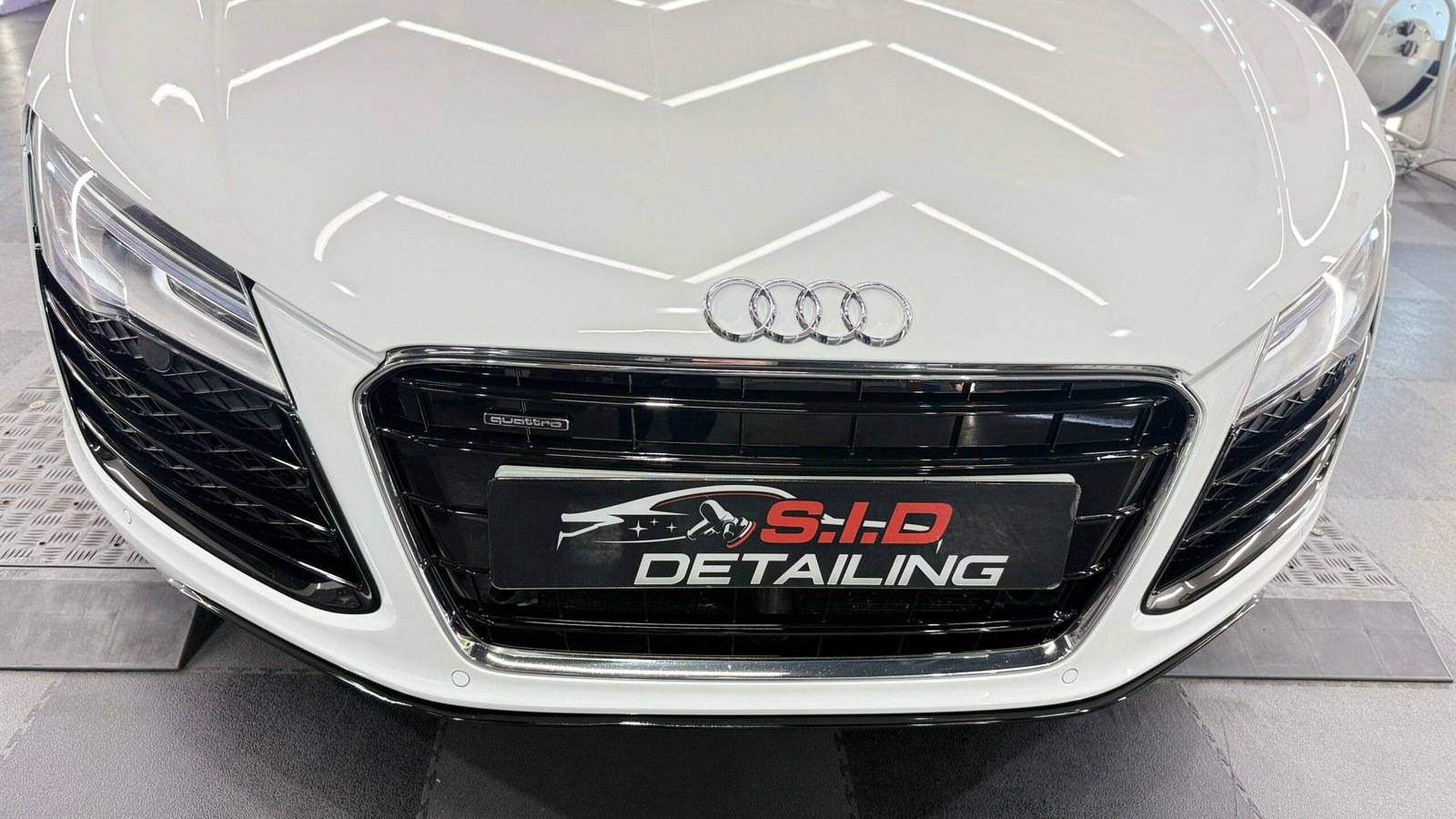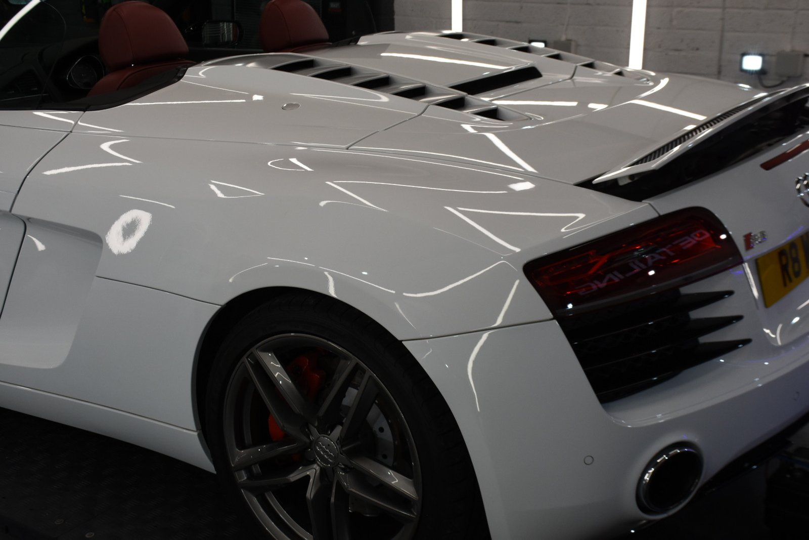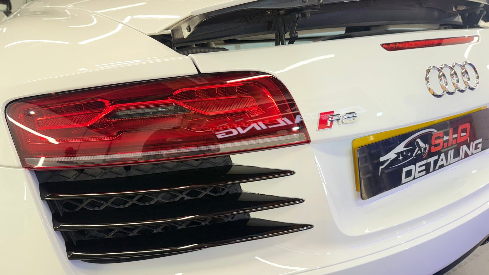 This R8 received multi-stage paint correction to perfect the finish, followed by ceramic coating on the body and wheels for long-term gloss and easy maintenance. The fabric roof was deep-cleaned and treated with a hydrophobic protector, ensuring tight water beading and durable convertible top protection.